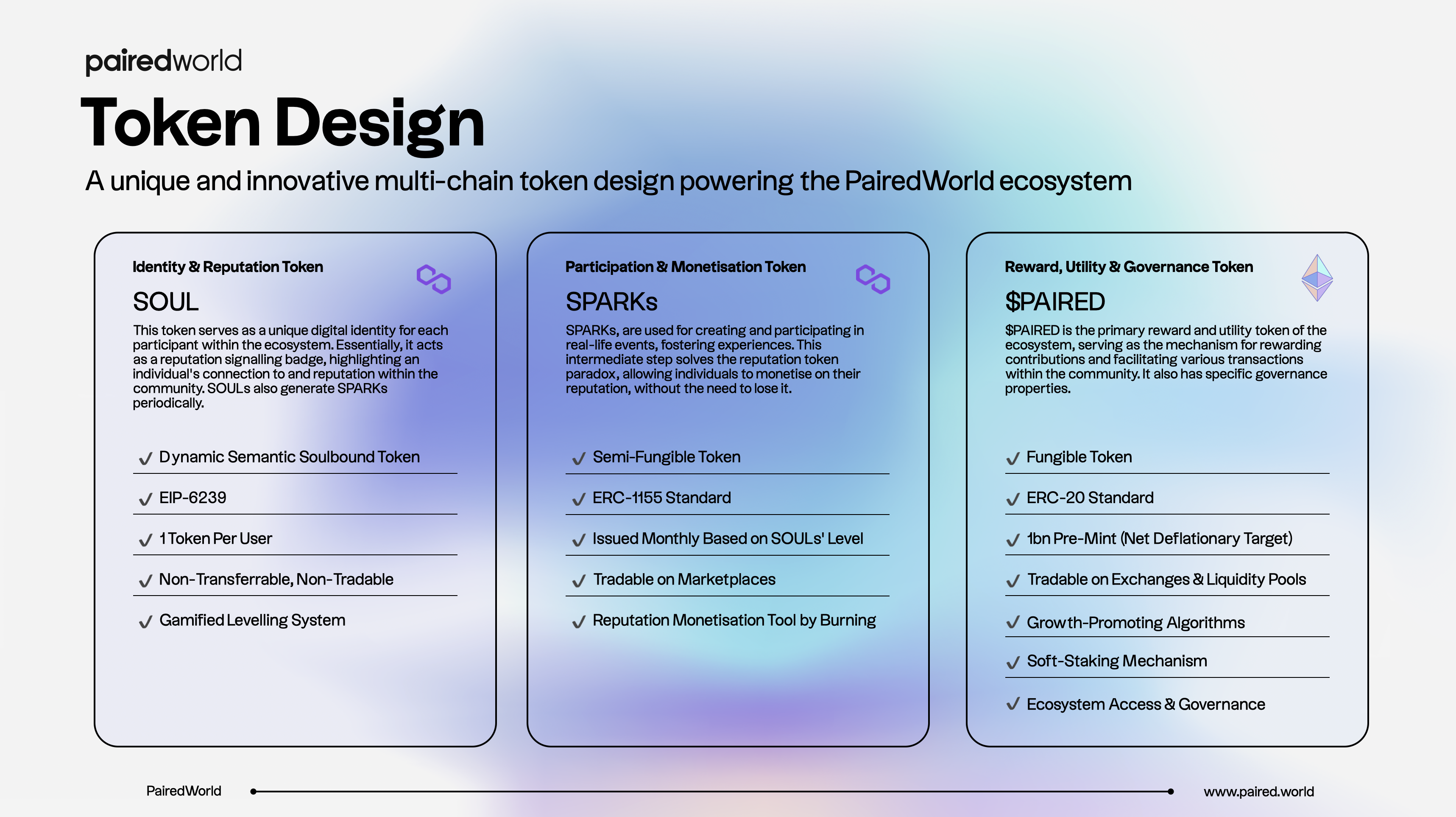 1. [**SOUL**](https://docs.paired.world/whitepaper/token-ecosystem/soul-token)  **(EIP-6239):** This token serves as a unique digital identity for each participant within the ecosystem. Essentially, it acts as a reputation signalling badge, highlighting an individual's connection to and reputation within the community. They also function as SPARKs generators.<br>